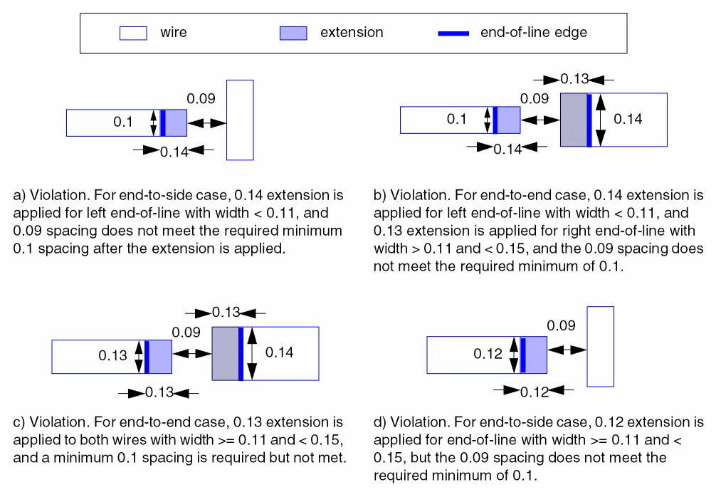 In this example, the minimum spacing between an end-of-line and a neighboring wire is 0.1 when extensions are applied under the following conditions:
