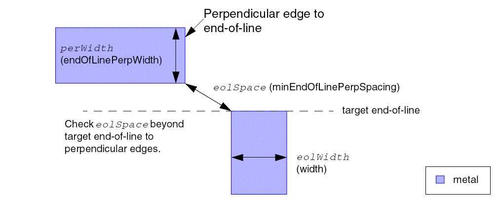 Specifies the minimum distance required between an end-of-line and a perpendicular edge. Typically, minEndOfLinePerpSpacing is slightly larger than minSpacing on the layer.
