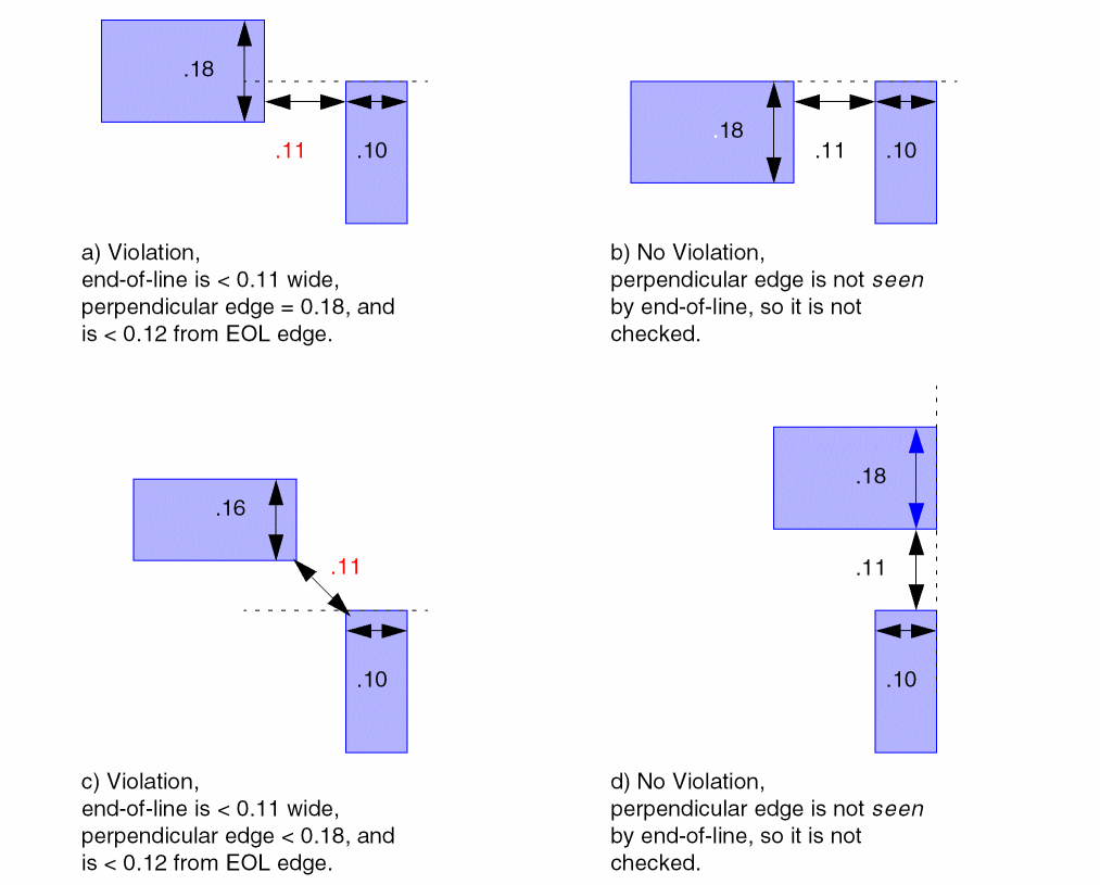 The following example requires a minimum spacing of 0.12 user units between an end-of-line of width less than 0.11 user units and a perpendicular edge that is less than or equal to 0.18 user units in length. In addition, a minimum spacing of 0.11 is set for shapes on the layer.
