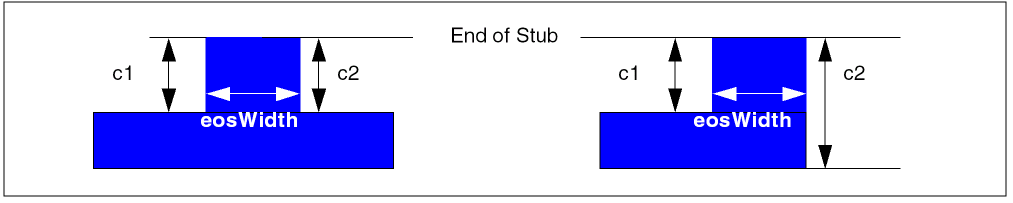The constraint applies when any geometry occurs within a region defined by the minEndOfStubSpacing constraint, the width of the stub (eosWidth), and the side length for maximum stubs (eosMaxLength) and/or minimum stubs (eosMinLength). The following figure shows examples of stubs where c1 and c2 are the stub sides.