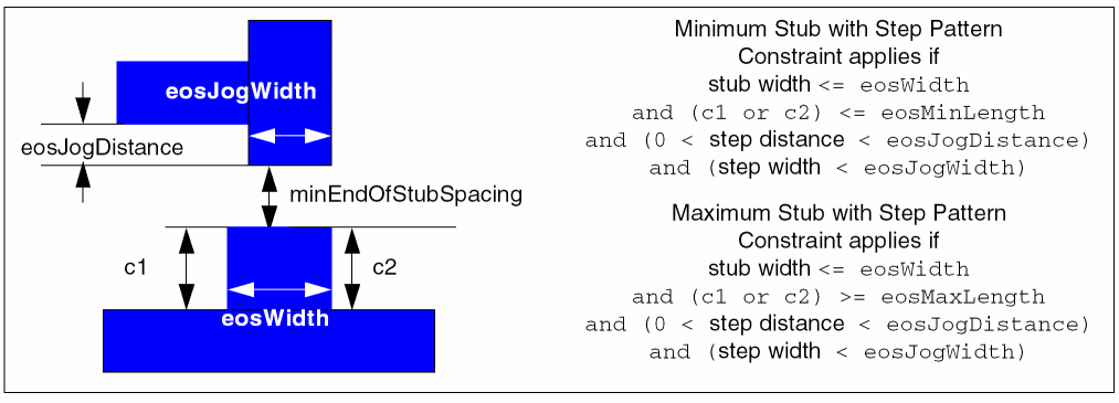 eosJogDistance(Value) andeosJogWidth(Value) are optional and specify the step pattern parameters. The step pattern is recognized when 0 < step distance <eosJogDistanceand step width <eosJogWidth. A violation occurs if a step pattern is found that is less thanminEndOfStubSpacingfrom the stub end. -