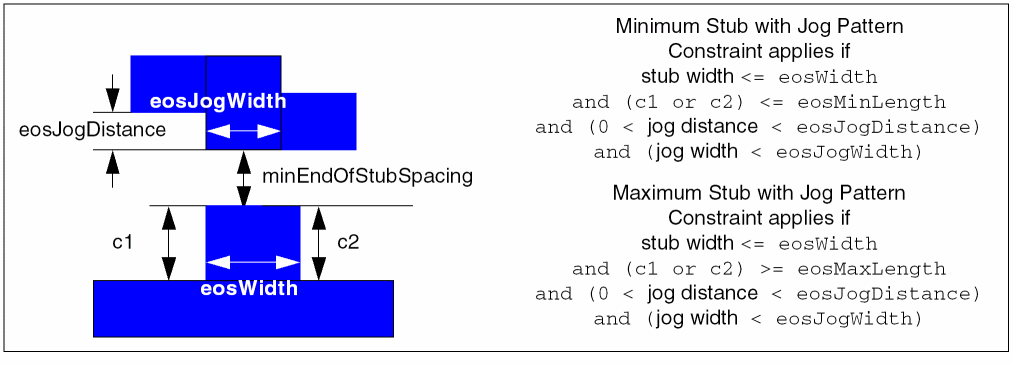 eosJogDistance(Value) andeosJogWidth(Value) are optional and specify the jog pattern parameters. The jog pattern is recognized when 0 < jog distance <eosJogDistanceand jog width <eosJogWidth. A violation occurs if a jog pattern is found that is less thanminEndOfStubSpacingfrom the stub end. -