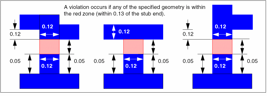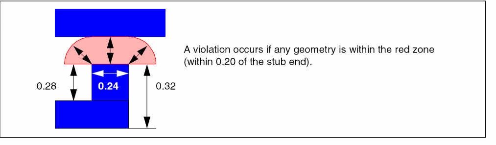 The following example for a minimum stub results in a violation whenever any wire is located within minEndOfStubSpacing of the stub end.