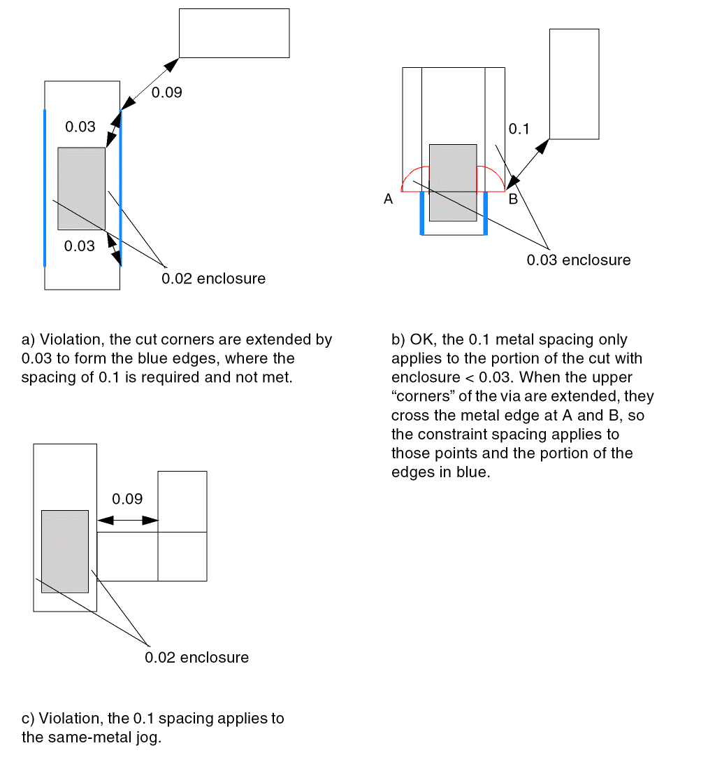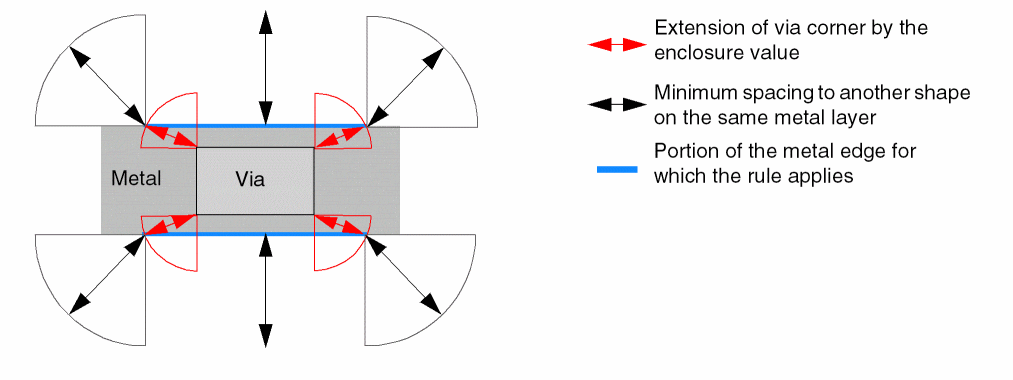 If the enclosure is less than the constraint enclosure value, the portion of the metal edge that applies to the constraint is determined by extending the via corner by the enclosure value in Euclidean style to intersect the metal edge, as shown by the blue lines in the following figure.