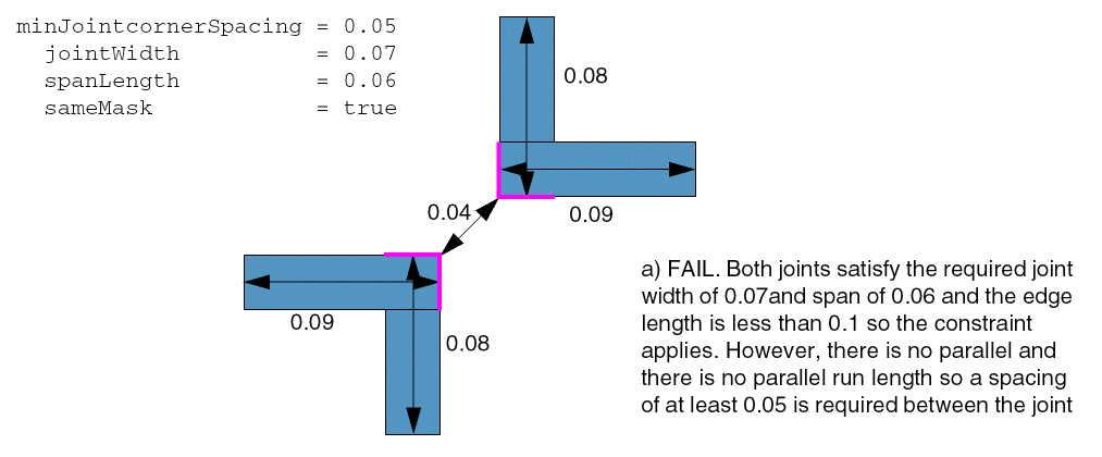 Specifies that the spacing between joint corners must be greater than or equal to 0.05 user units and the width and span length of a joint must be greater than 0.07 and 0.06 user units respectively. Additionally spacing is only applied to same-mask objects.