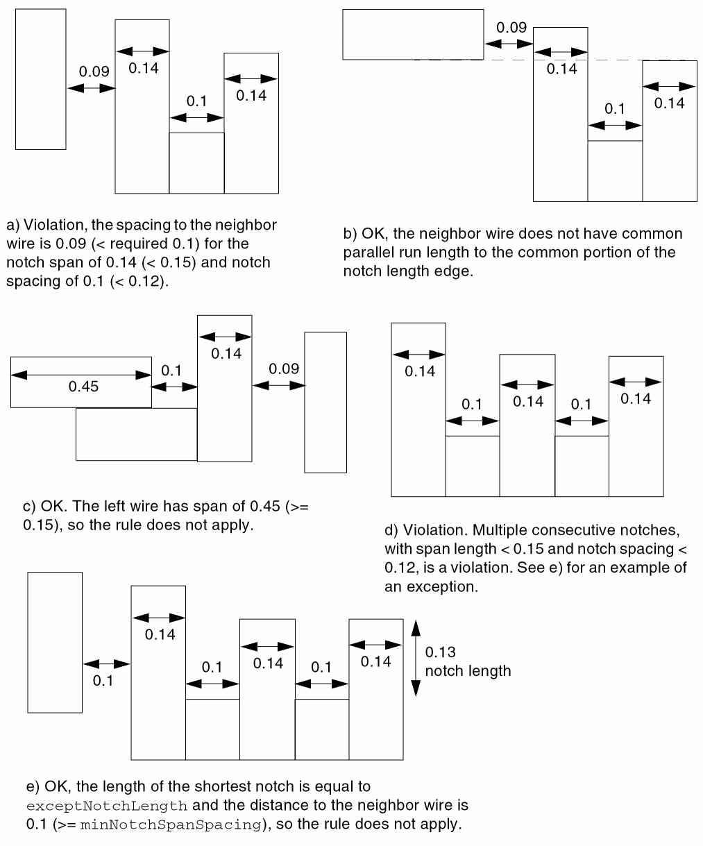 In this example, the minimum spacing is 0.1 μm between neighbor wires and a notch where the span of the legs on either side is less than 0.15 μm, and the legs are less than 0.12 μm apart. In addition, even if the neighbor wires are farther away than the specified spacing, if there are two consecutive U-shaped notches where the span is less than 0.15 μm, and the legs are less than 0.12 μm apart, it is considered a violation. However, if the length of the smallest notch is 0.13 μm and the distance between the outer edges of the notches and neighbor wires is greater than or equal to 0.1 μm, the rule does not apply.