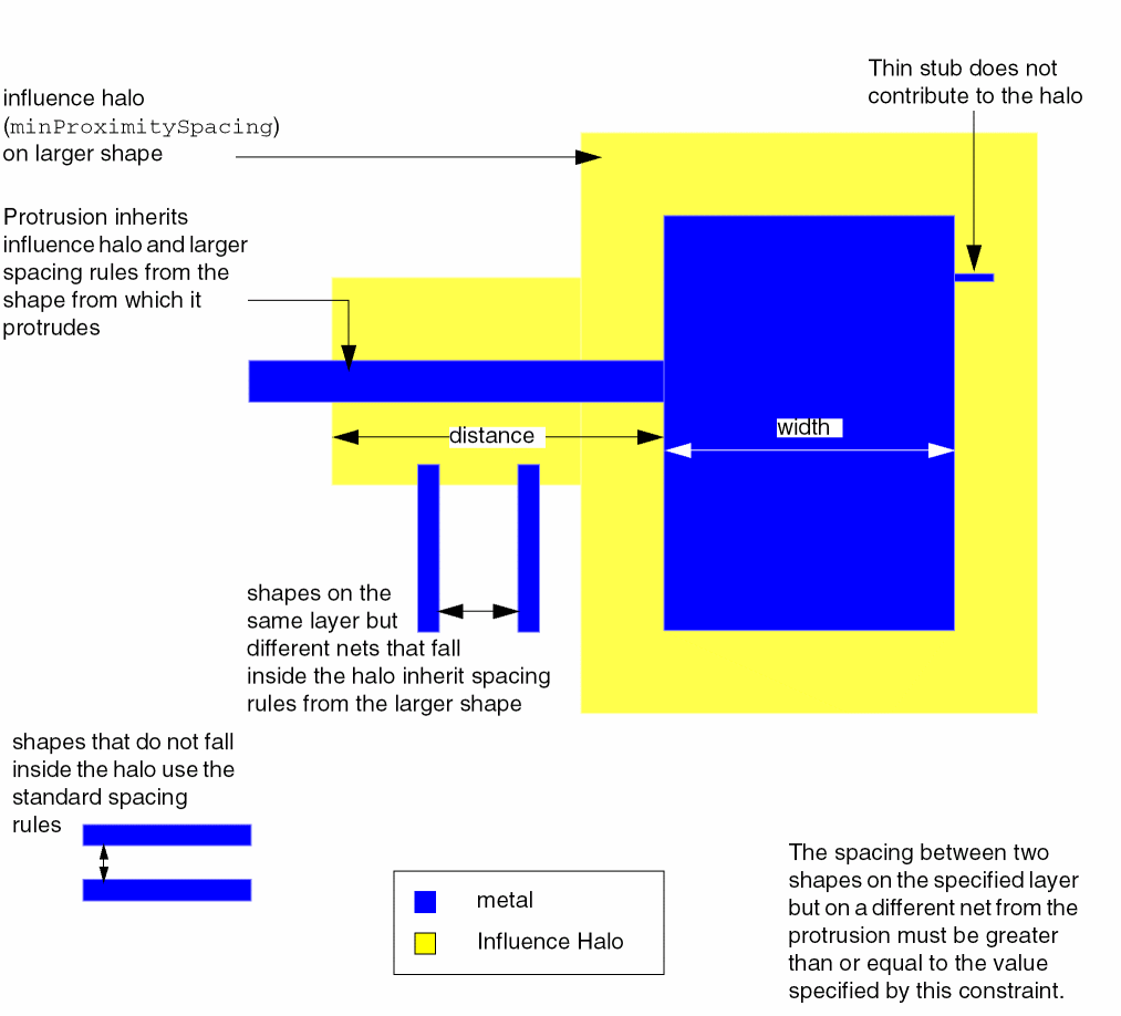 Sets the minimum spacing between a protrusion from a wide wire and shapes that fall within a specified distance of a shape of a specified width. The protrusion contributes to the proximity halo of the larger shape. The smaller shapes effectively pick up the spacing required by the wider shape.