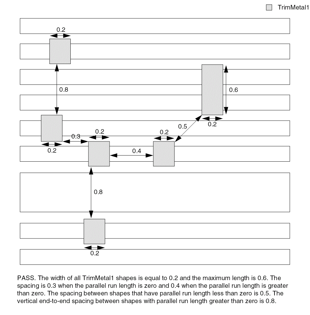 Specifies that the spacing between two shapes must be greater than or equal to 0.3 if the parallel run length between the two shapes is zero. If the parallel run length between the two shapes is greater than zero, the spacing between them must be greater than or equal to 0.4. Otherwise, the spacing between the two shapes must be greater than or equal to 0.5.