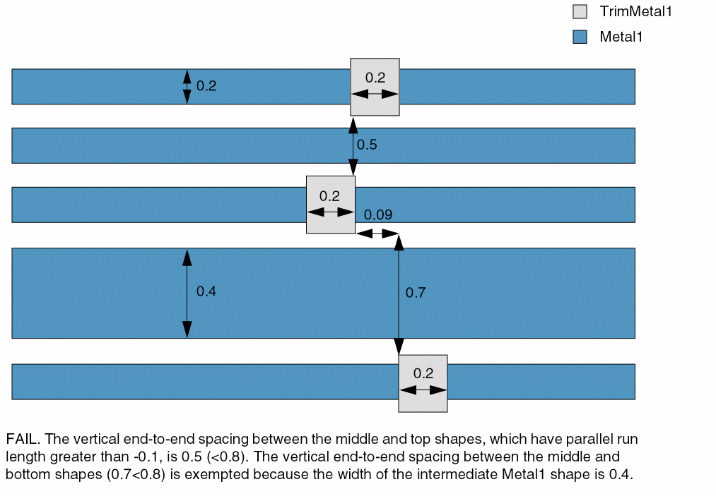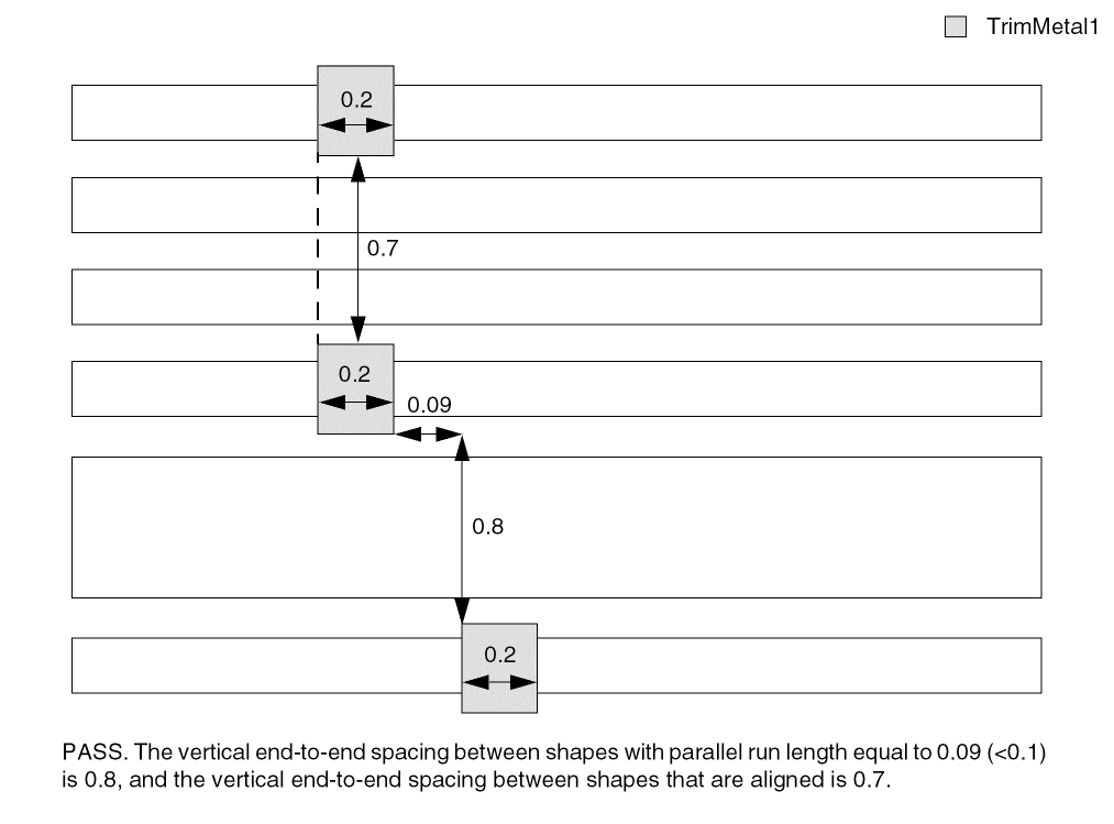 Specifies that the end-to-end spacing in the vertical direction must be greater than or equal to 0.8 if the parallel run length between the shapes is greater than -0.1. If the shapes are aligned, the end-to-end spacing in the vertical direction must be greater than or equal to 0.7. Otherwise, the spacing between the shapes must be at least 0.5.