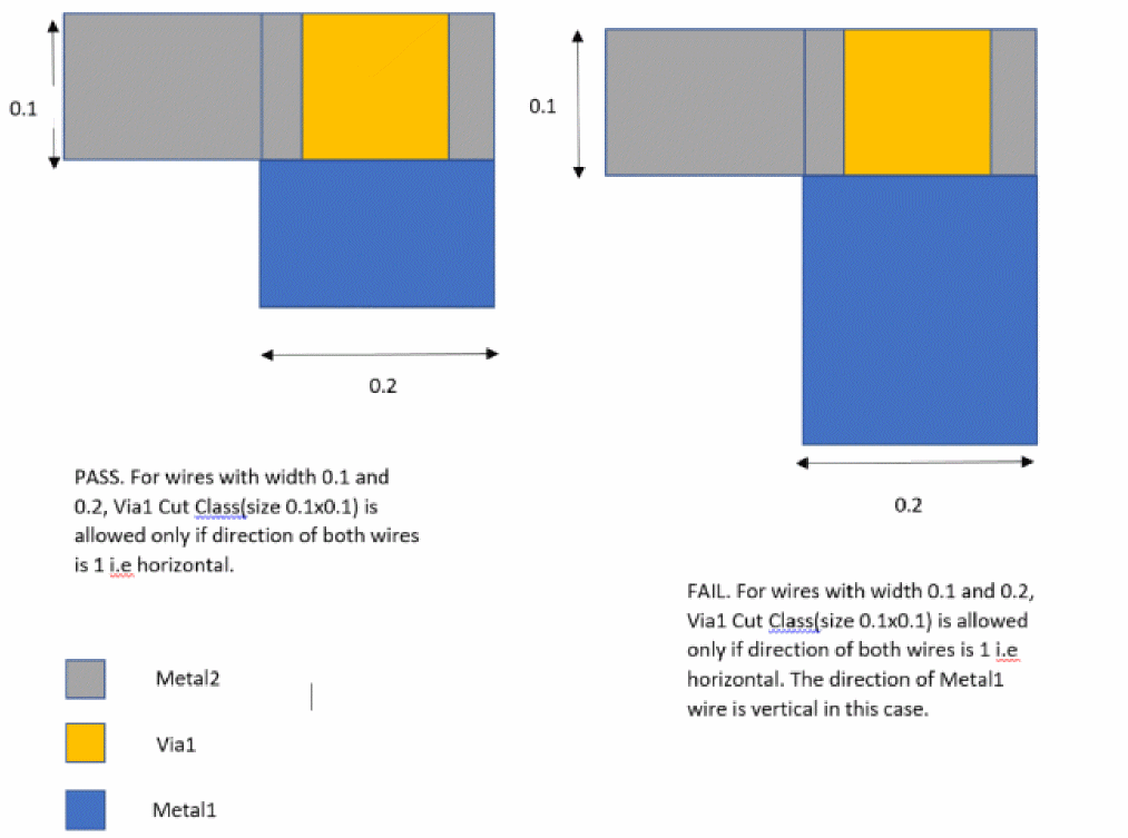 Specifies that a 0.1x0.1 cut class on layer Via1 is allowed between Metal1 and Metal2 wires only if both wires are greater than 0.1 or 0.2 user units in width and direction for both Metal1 and Metal2 wire is horizontal.