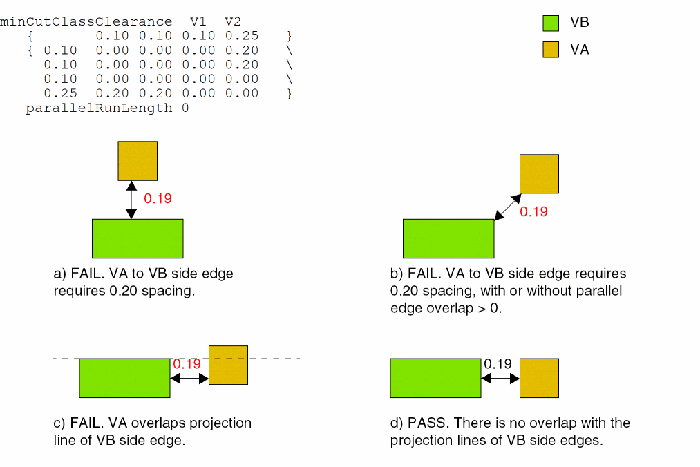 Sets the minimum clearance between VA (0.1 x 0.1) and VB (0.1 x 0.25) cut classes on V1 and V2 as follows: