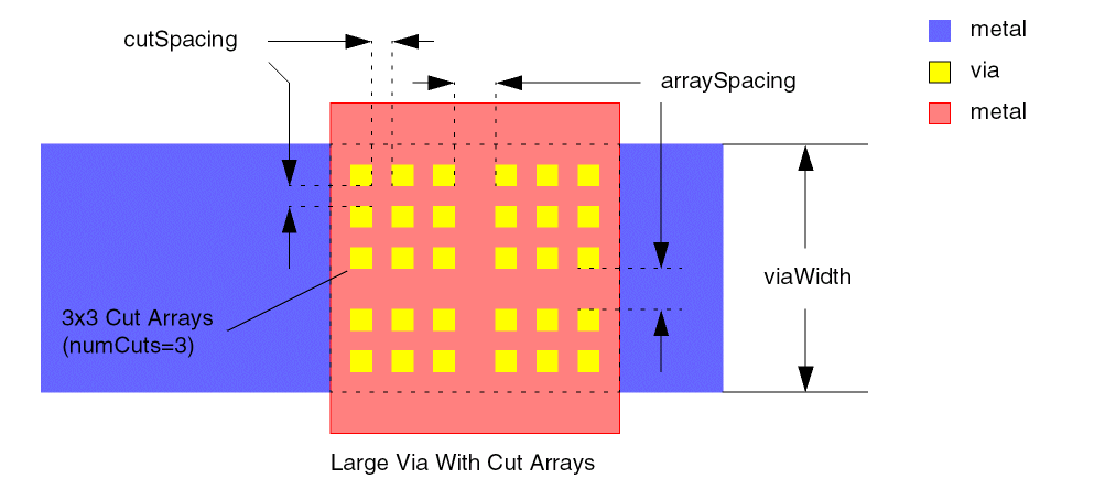 Specifies the minimum width of a via array for it to be considered a large via array and must be built with the spacing given by the minLargeViaArraySpacing constraint. The minimum width applies to the intersection of the top and bottom metal layers in the via that are connected by the cut layer.