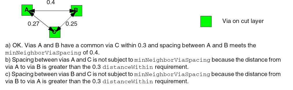 This example requires a 0.4 neighbor via spacing if a common neighbor via is within 0.3 user units measured center-to-center.