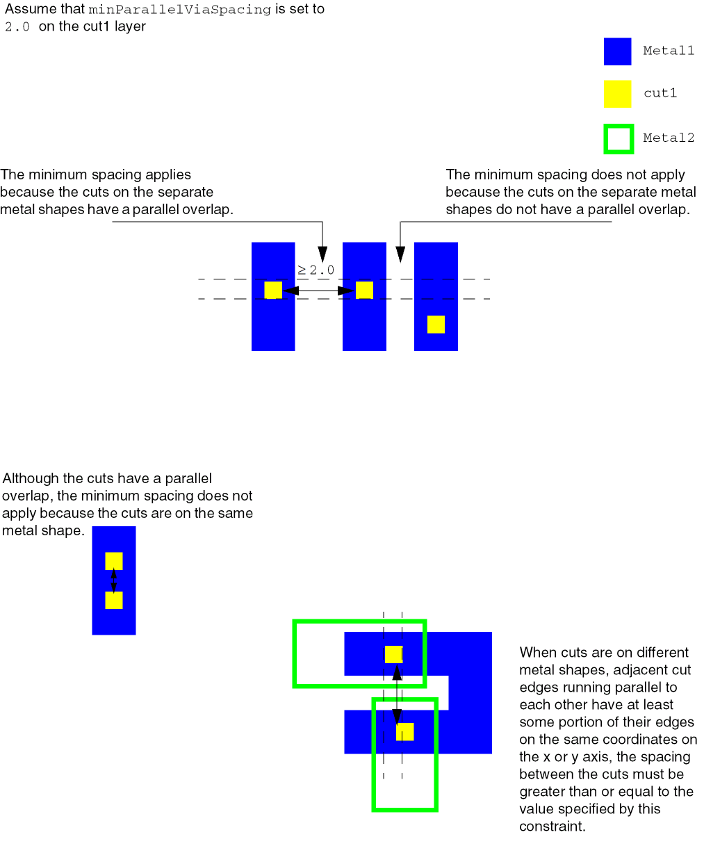 Specifies the minimum spacing for vias that have parallel edges with an overlap greater than 0. This constraint applies to cut layers only when vias do not share the same metal above or below and are on different nets.