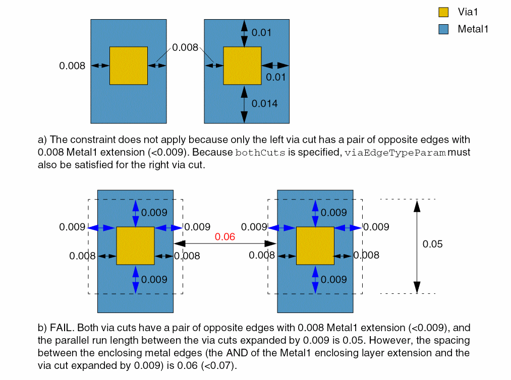 - Both via cuts have Metal1 extensions less than or equal to 0.009 on a pair of opposite edges.