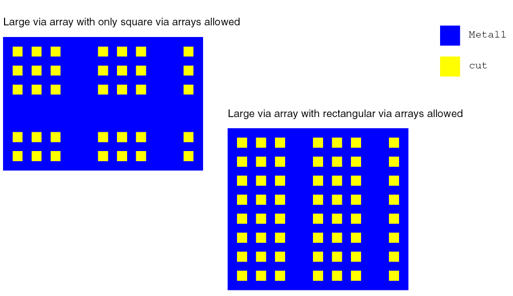 This example allows rectangular via arrays on the layer cut1; prohibits rectangular via arrays on the layer cut2.