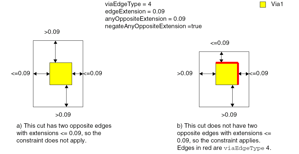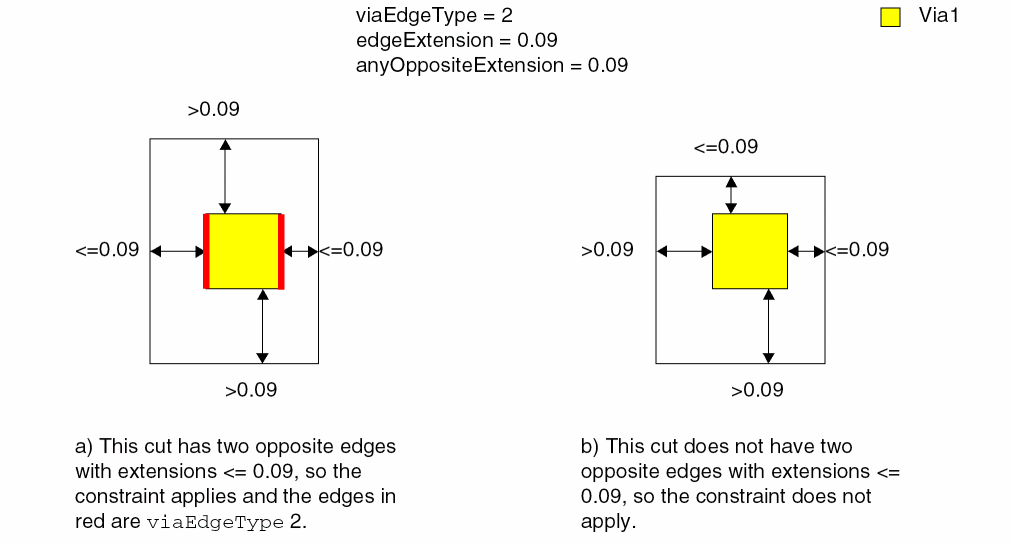 In this example, the constraint applies only to cuts that do not have two opposite edges with extension less than or equal to 0.09 user units. For those cuts, via edges with extensions less than or equal to 0.09 user units, will be assigned to viaEdgeType 4.