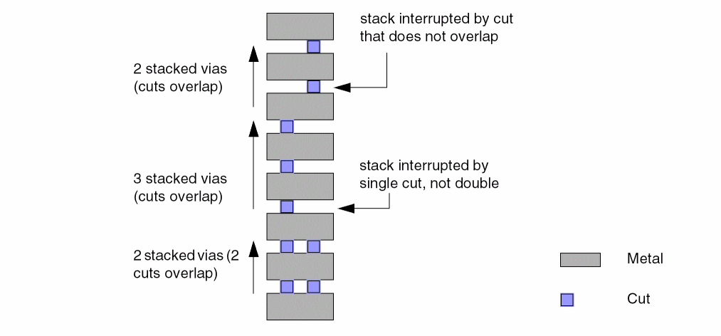 Specifies the maximum number of single-cut stacked vias that are allowed in one continuous stack. A via is considered to be in a stack with another via if the cut of one via overlaps any part of the cut of the other via. A double-cut or larger via interrupts the stack.