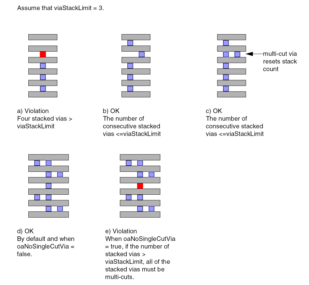 oaNoSingleCutVia(BoolValue, optional) chooses whether stacked vias can be single-cut (false, default) or must be multi-cut (true). If set totrue, via stacks taller than the constraint value must consist of all multiple-cut vias.