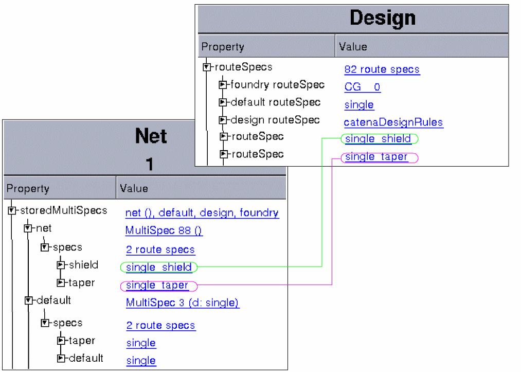 The shield and taper constraint groups are assigned to net 1 and can be viewed in the Properties Browser in the storedMultiSpecs property for the net as shown in the following figure. The constraints set in the single_shield constraint group are used for shielding, while the constraints set in the single_taper constraint group are used for tapering on the net.