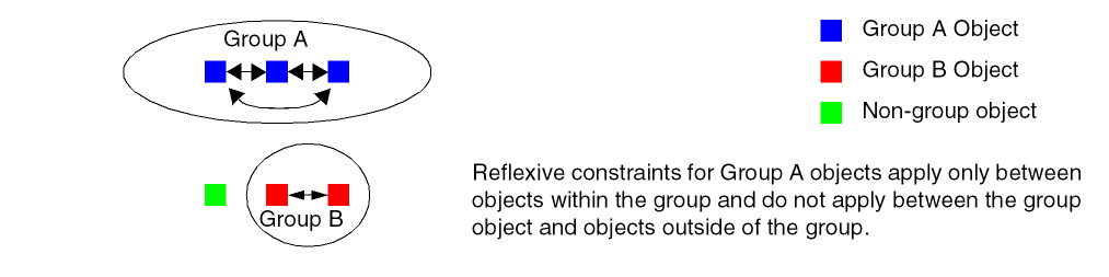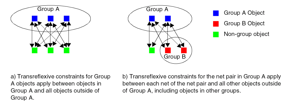 TransReflexive constraints apply between each object in an object group and all objects outside the object group as shown in the following figure. The constraints do not apply between objects in the group, nor do they apply between objects outside the group. If the group contains a sub-group, then the transReflexive constraints apply between the sub-group objects and all objects outside the group, but the constraints do not apply between objects within the sub-groups nor between objects in the sub-groups and other sub-groups, or objects in the parent group. This type of constraint group is useful for cases such as net pairs and buses. For example, to minimize noise around a net pair, you could specify a larger spacing as a transReflexive constraint for the net pair, which would require a bigger gap between the net pair and surrounding nets.