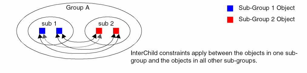 InterChild constraints are also referred to as Group-to-Group constraints. Constraints in an interChild constraint group apply between the relevant objects in a sub-group and all objects in other sub-groups of the same parent group as shown in the following figure. For example, to route some signal nets close to power rails, you can create a group of the signal nets, a group of power nets, and identify the groups as good neighbors by specifying crosstalkNeighborIndex as an interChild constraint for the two groups. If interChild constraints are applied to a group that has no sub-groups, then the constraints are applied as reflexive constraints.