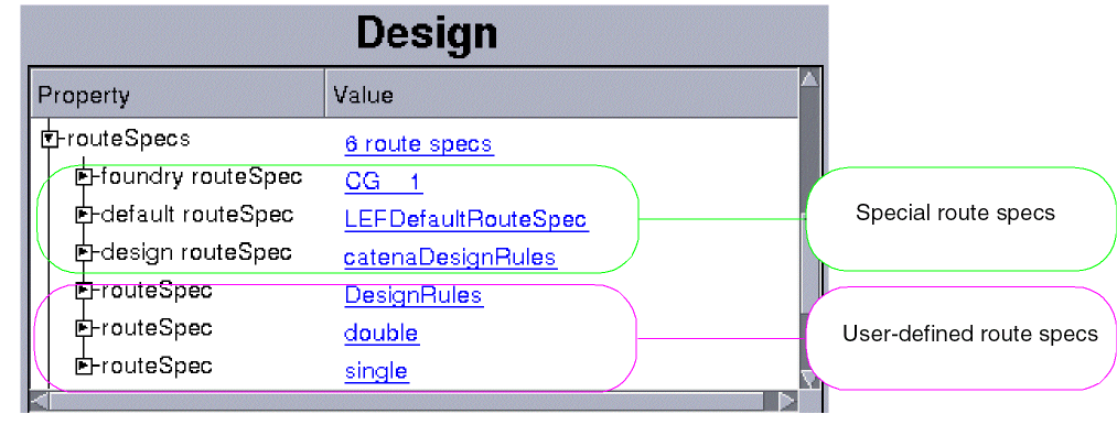 All other route specs are considered to be user-defined route specs. For a list of route specs defined in a design, use the Properties Browser and view the routeSpecs property for the design. The Browser’s display defaults to the design’s properties when no objects are selected.