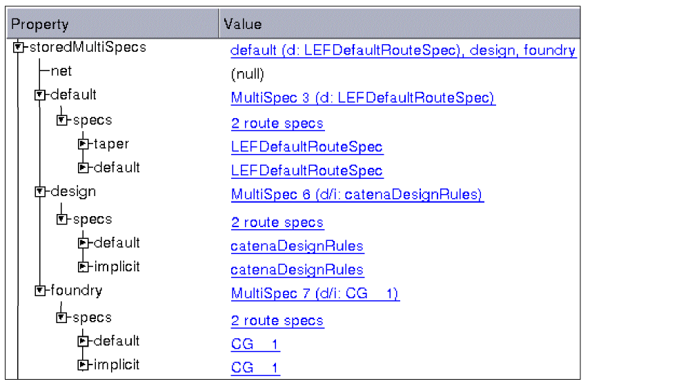 The following figure shows an example of the stored multispecs for a net displayed by the Properties Browser.