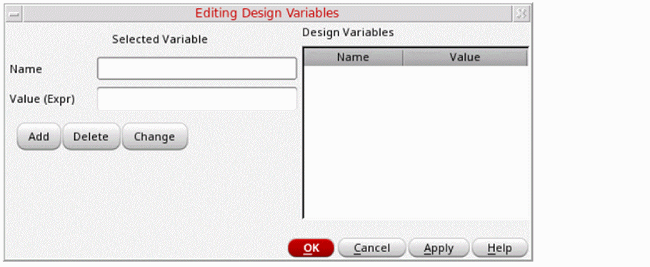 The design variable appears in the Design Variables list on the right and is saved in thecds_globals.svfile. - Click Delete to delete a design variable by selecting the variable name from the Design Variables list box.