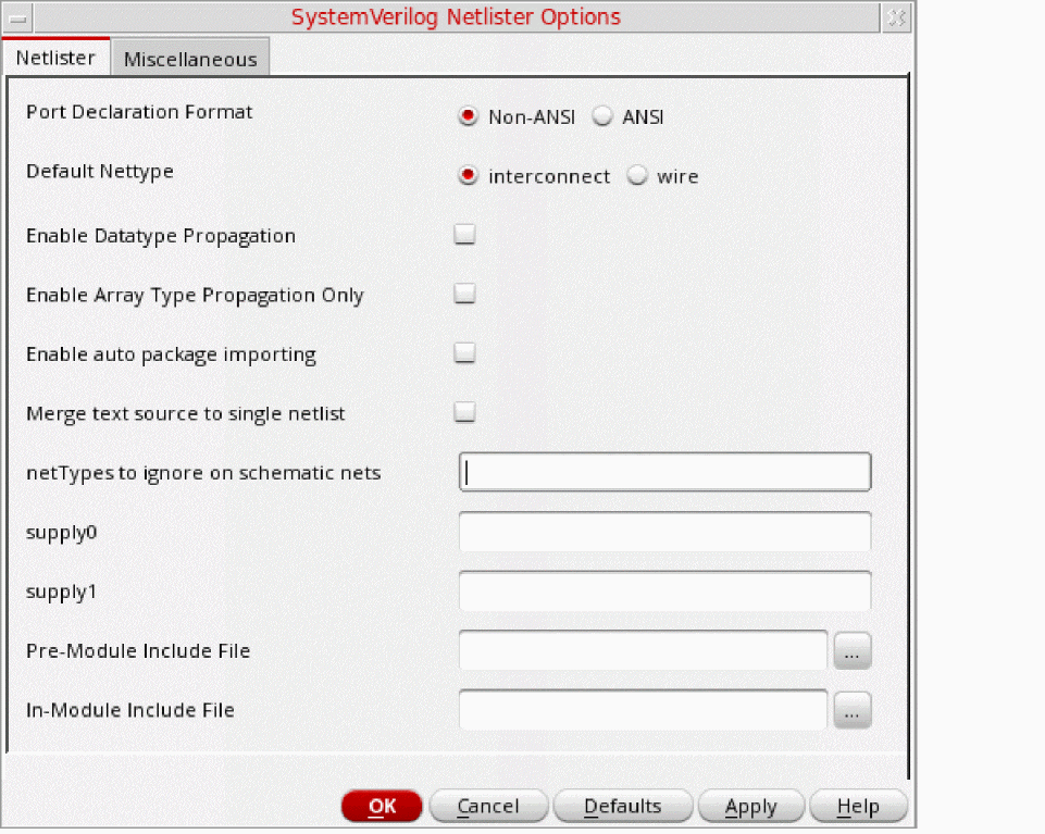 In the Netlister and Miscellaneous tabs of the SystemVerilog Netlister Options form, specify the required values or options and click OK.