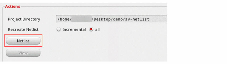 After setting up options and variables for the selected design, click Netlist in the Actions group box of the SystemVerilog Netlister window.