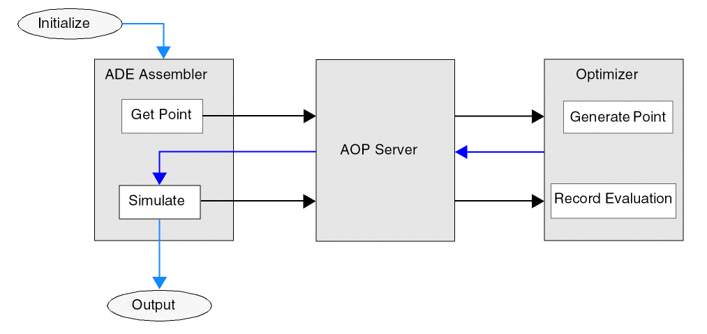 This workflow facilitates an iterative optimization process where ADE Assembler, AOP Server, and the Optimizer work together to explore and refine the design space until the desired objectives are achieved.