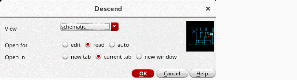 Right-click the selected instance, and choose Descend Read to descend into the schematic of the selected design.