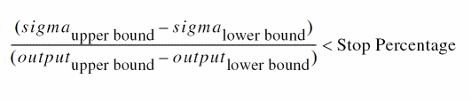 The Confidence Interval - Autostop method automatically stops Monte Carlo analysis when the confidence interval for the output standard deviation divided by the output value range falls below the Stop Percentage value. The default Stop Percentage value is 5%.