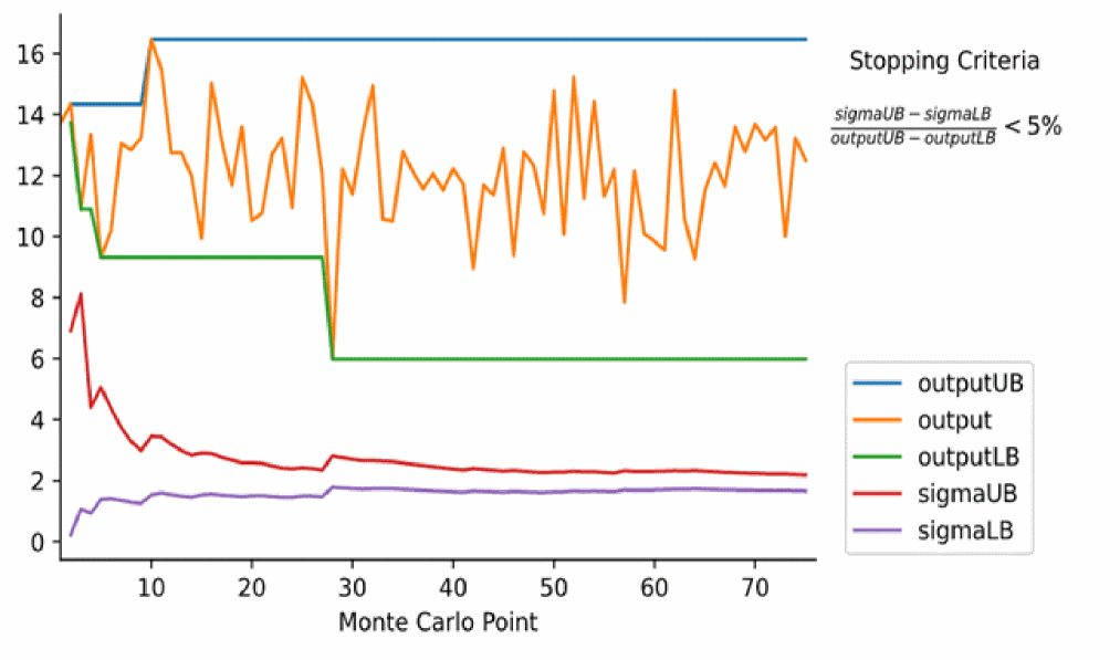 The following figure shows that for Stop Percentage = 5%, the Monte Carlo run stops automatically after completing simulation of 75 sample points.
