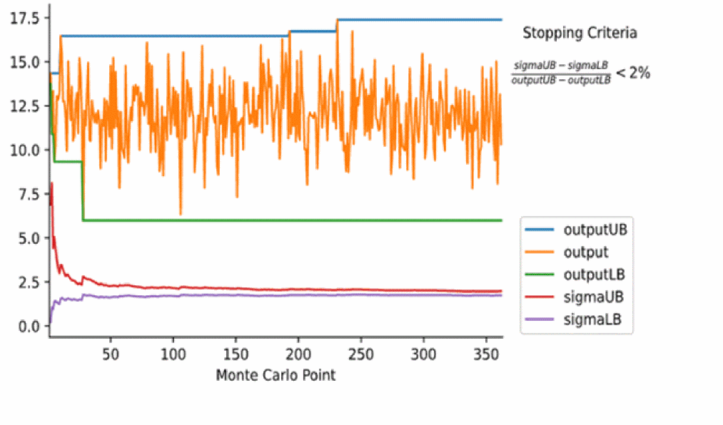 The following figure shows that for Stop Percentage = 2%, the Monte Carlo run stops automatically after simulating 362 sample points.