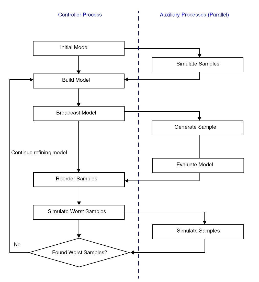 The FMC method also supports multi-process distribution to further improve the performance. The sample generation, model evaluation, and simulation are processed by worker processes running in parallel.