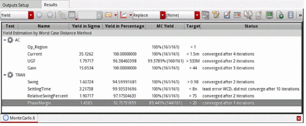 After the Monte Carlo run for the Worst-Case Distance (WCD) method completes, the Yield view of the Results tab shows the yield estimation.