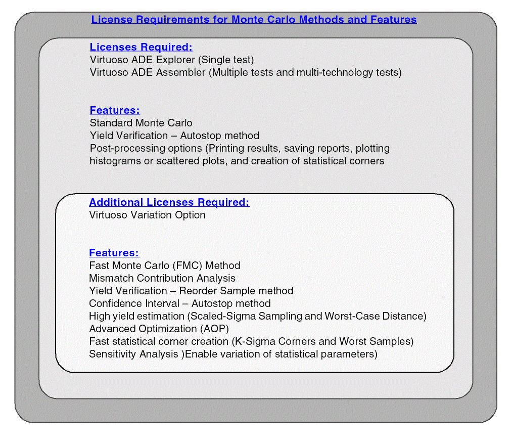 The following figure shows the licenses required to run various Monte Carlo methods and features.