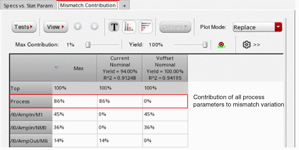 If you run the mismatch contribution analysis by selecting All as Variation on the Monte Carlo form, an additional Process row is displayed in the mismatch contribution results, as shown in the following figure. This row shows the contributions of all the process parameters to mismatch variation.