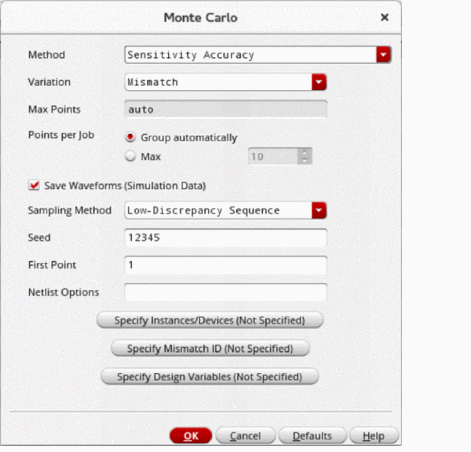 The modeling of variation in the outputs due to statistical variation can be done by using the post-processing option to view and analyze the mismatch contribution results. Therefore, for mismatch contribution analysis, it is required that you select this check box to save the data for Monte Carlo analysis so that it can be later used for post-processing. - From the Sampling Method drop-down list, select Low-Discrepancy Sequence.