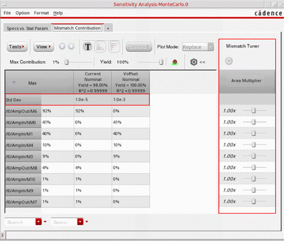 For each instance, a row is added to the Mismatch Tuner pane. Each row has a slider to change the area multiplier of the corresponding instance. In addition, the Std Dev row is displayed as the first row in the Mismatch Contribution table. This row displays the standard deviation for each output.