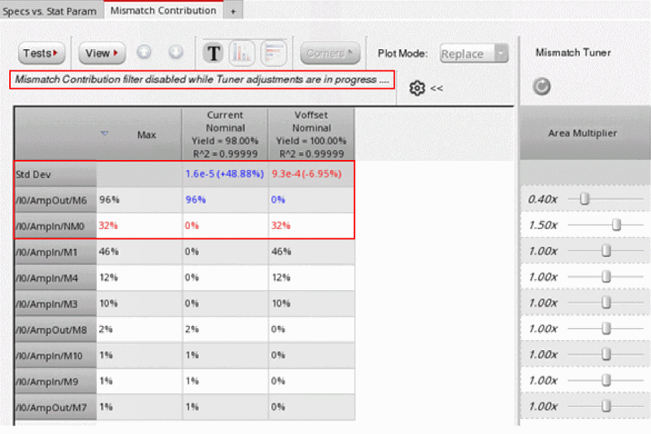 You can use Mismatch Tuner on the Mismatch Contribution tab to perform what-if analysis on how a change in the size of any device instance impacts the variation of the circuit output. The mismatch tuner helps you tune the contribution of an instance by changing its area multiplier.