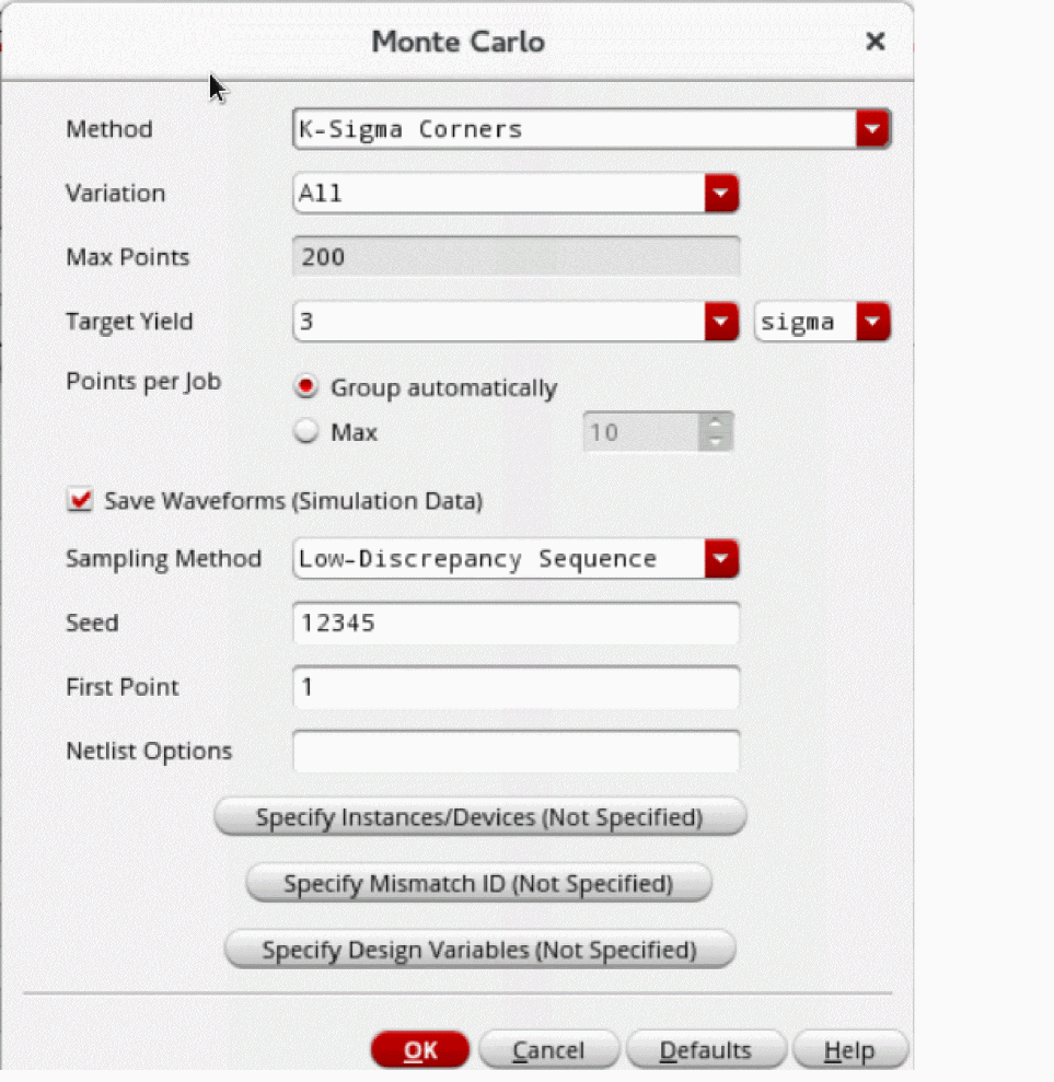 This field is set to200points for the K-Sigma Corners method. - Select the Save Waveform (Simulation Data) check box to save the waveform data so that it can be used later for post-processing.
