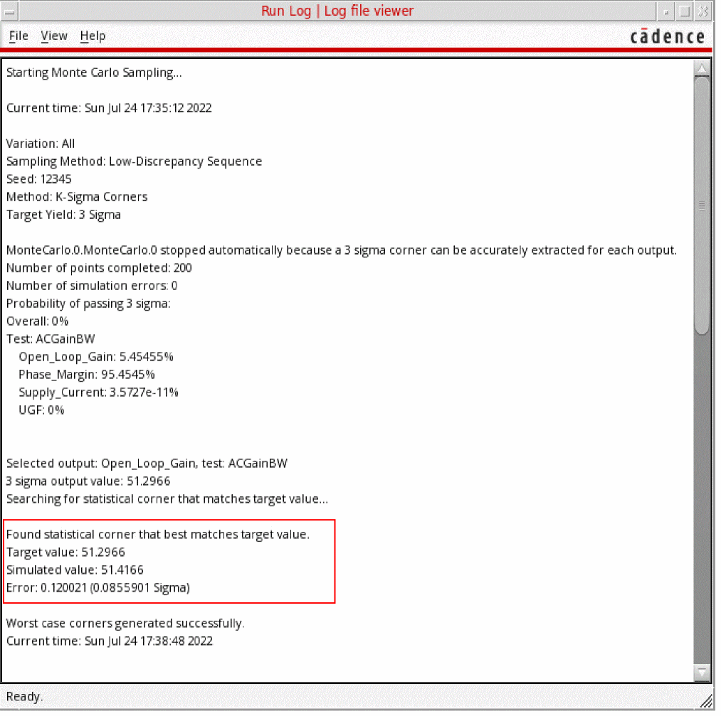 The Run Log reports both the estimated K-Sigma value of the specification (based on the PDF) and the simulated value of the corner.
