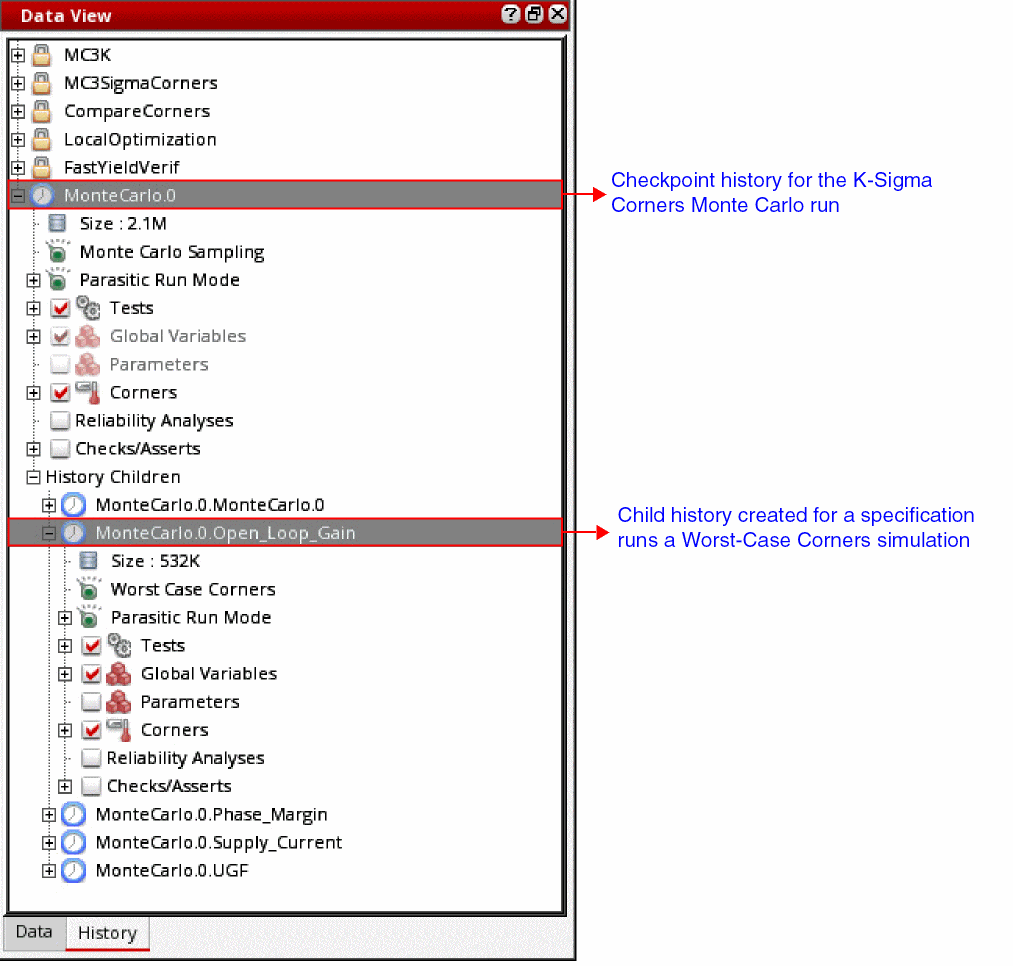 The MonteCarlo.N history is created first and shows the general simulation data set for the simulation. Next, the simulation run proceeds to extract the statistical corners and a child history is created for each spec with run mode set to Worst-Case Corners.