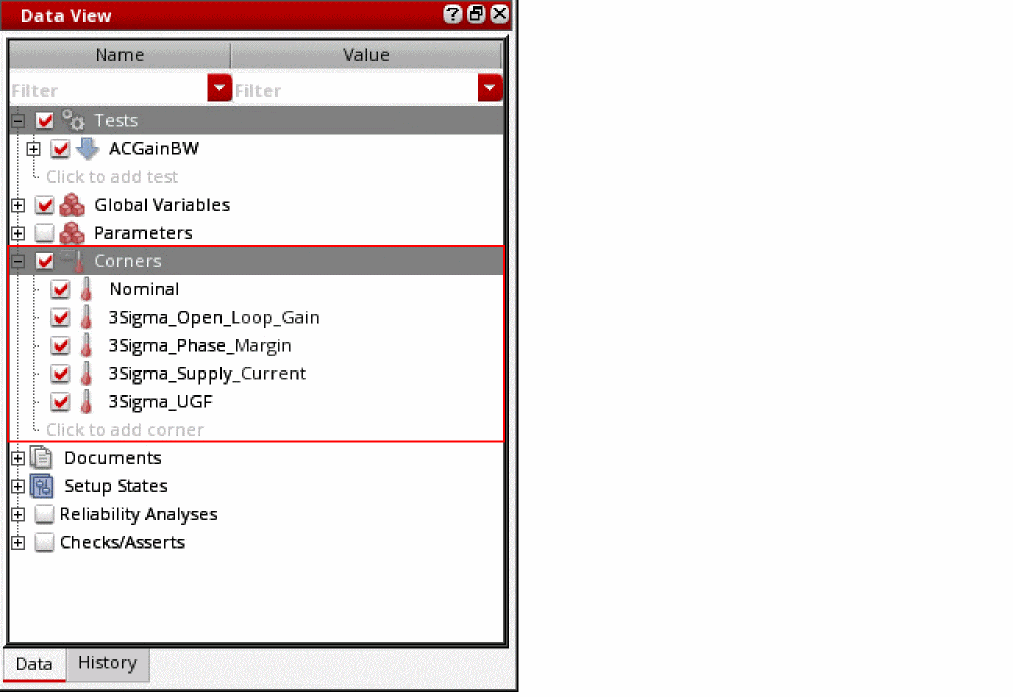 After worst-case corners are created for all the specifications, the simulation creates 3-sigma statistical corners for each specification. These corners are displayed in the Data View assistant and the Corners Setup form: