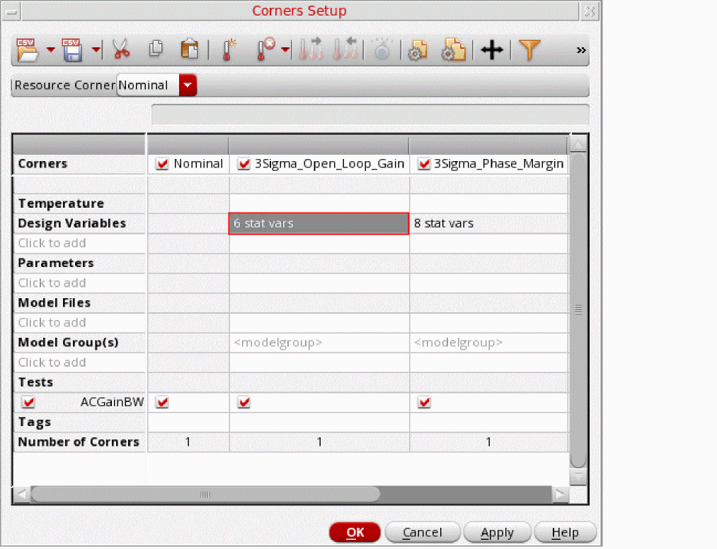 You can view the details of statistical parameters that are used to create a K-Sigma corner by double-clicking the cell in the Design Variables row under the column for that corner in the Corners Setup form.