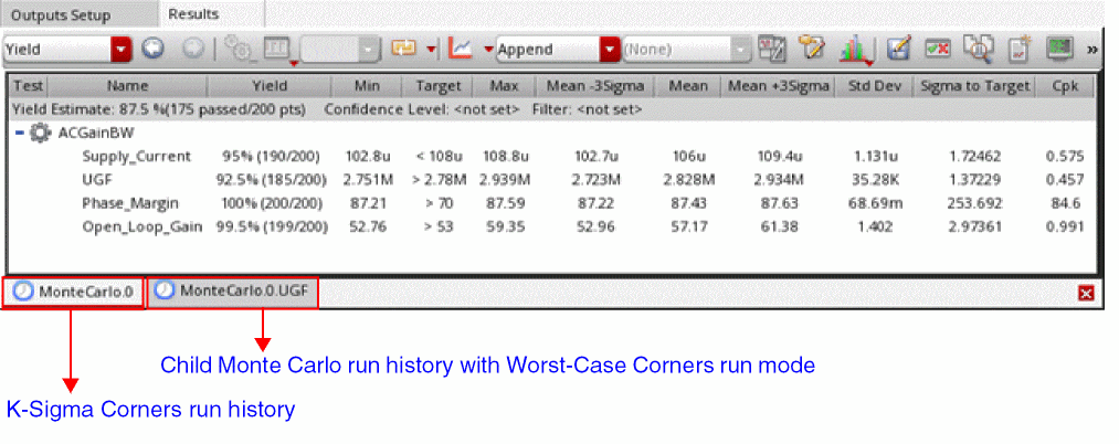 On the Results tab, two tabs are displayed at the bottom for this Monte Carlo simulation run—MonteCarlo.N and MonteCarlo.N.specification_name, where MonteCarlo.N is the history for the K-Sigma Corners run and MonteCarlo.N.specification_name is the child history for the Worst-Case Corners run for the last specification in the setup.