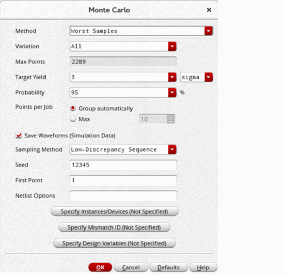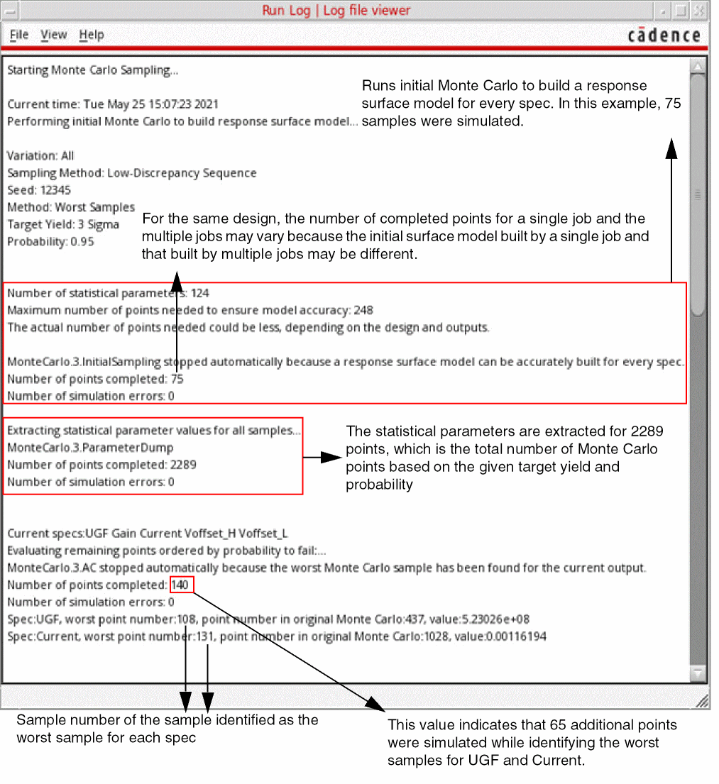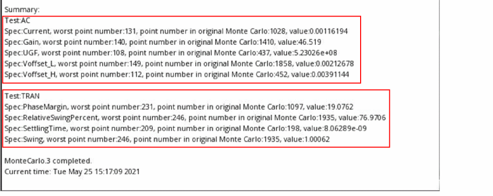 The simulation run first performs initial Monte Carlo to reorder samples and then runs the worst sample algorithm to generate the worst sample for each specification. The following run log is generated for this simulation run.